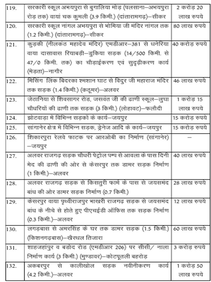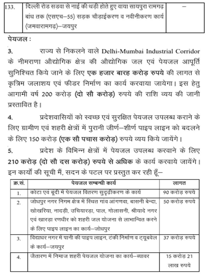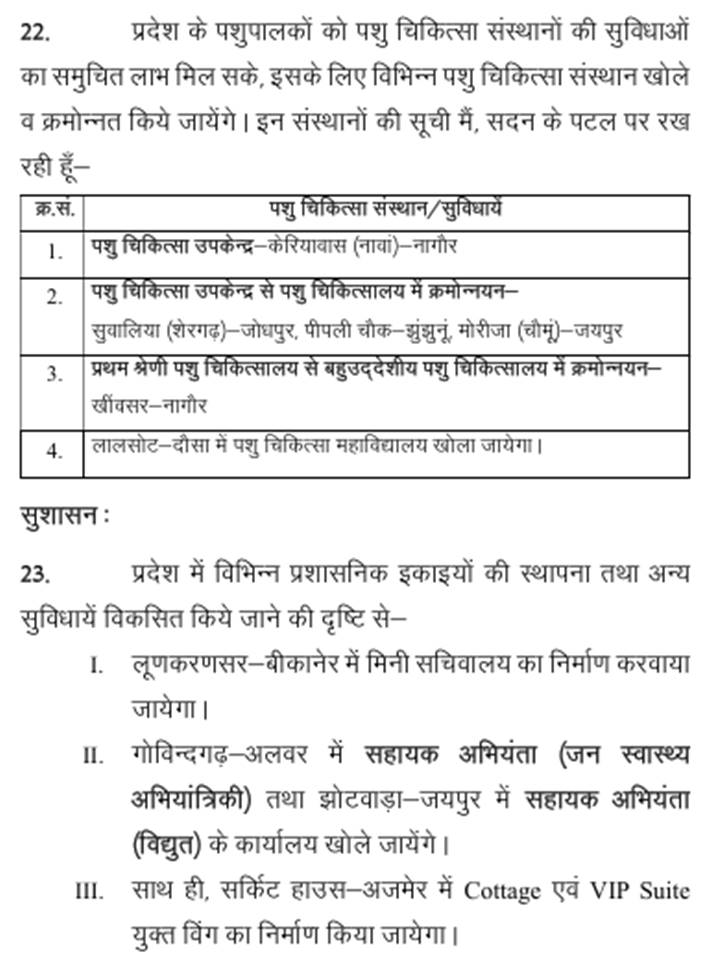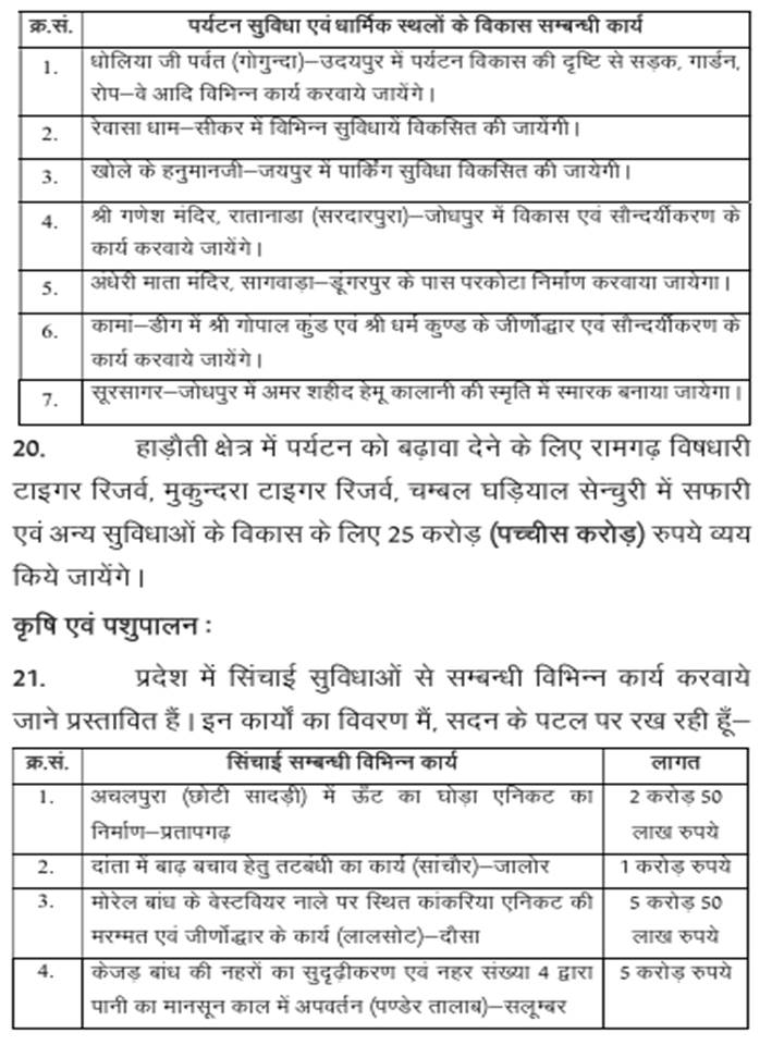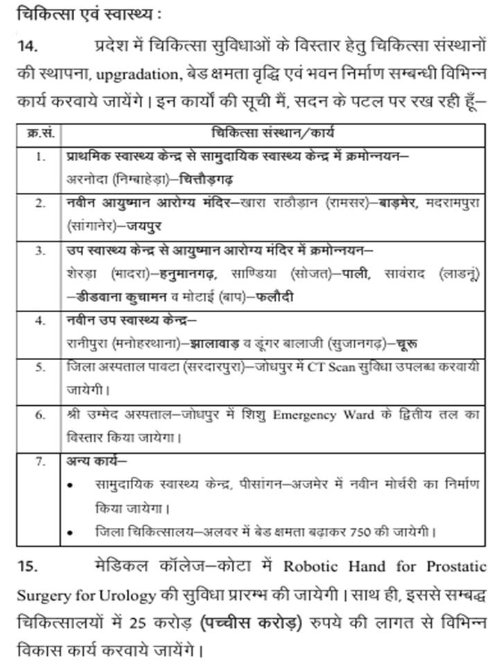 वित्त मंत्री ने लूणकरणसर-बीकानेर में मिनी सचिवालय के निर्माण, गोविन्दगढ़-अलवर में सहायक अभियंता (पीएचईडी) और झोटवाड़ा-जयपुर में सहायक अभियंता (विद्युत) के कार्यालय खोलने व चाबा (शेरगढ़)-जोधपुर में नवीन पुलिस चौकी तथा धावा (लूणी)-जोधपुर में पुलिस थाना शुरू करने की भी घोषणा की।