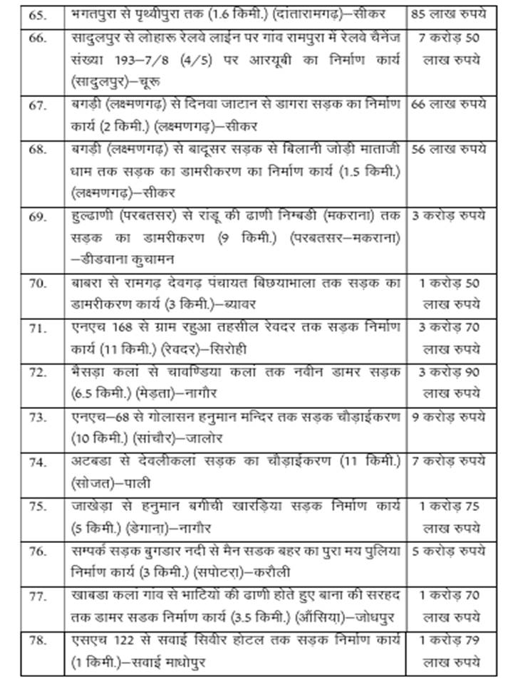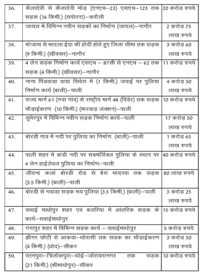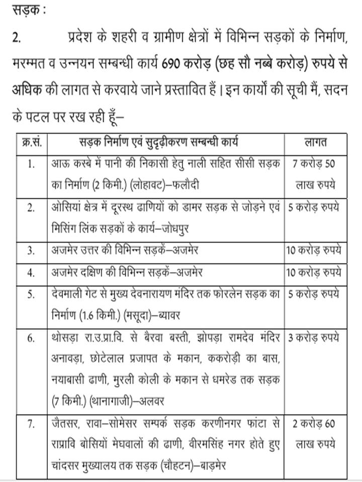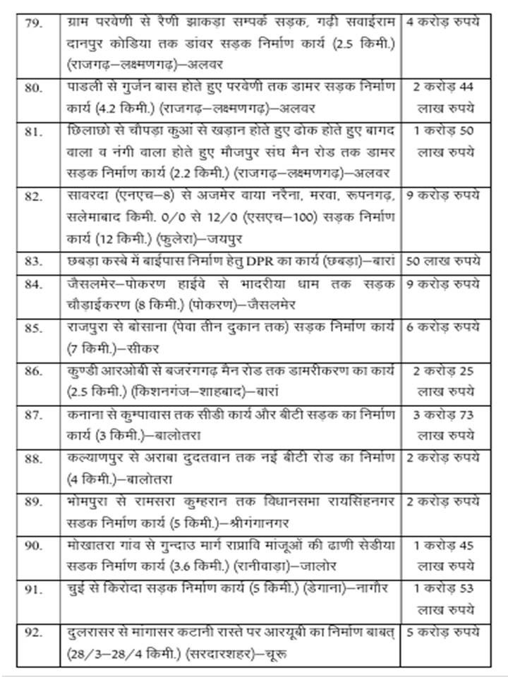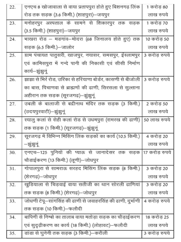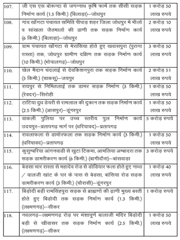 वित्त मंत्री ने लूणकरणसर-बीकानेर में मिनी सचिवालय के निर्माण, गोविन्दगढ़-अलवर में सहायक अभियंता (पीएचईडी) और झोटवाड़ा-जयपुर में सहायक अभियंता (विद्युत) के कार्यालय खोलने व चाबा (शेरगढ़)-जोधपुर में नवीन पुलिस चौकी तथा धावा (लूणी)-जोधपुर में पुलिस थाना शुरू करने की भी घोषणा की।