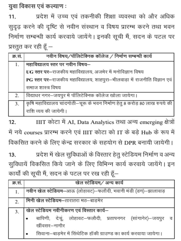 वित्त मंत्री ने कहा कि कोटा-बूंदी में निर्माणाधीन ग्रीन फील्ड एयरपोर्ट के नजदीक रीको द्वारा वृहत औद्योगिक क्षेत्र विकसित किया जाएगा। इससे लॉजिस्टिक और टैक्सटाइल से सम्बंधित उद्योगों की स्थापना हो सकेंगी। ट्रिपल आईटी, कोटा में एआई,डेटा एनालिसिस और अन्य उभरते हुए क्षेत्रों में नए कोर्स प्रारम्भ किये जाएंगे एवं इसे आईटी हब के रूप में विकसित करने के लिए केन्द्र सरकार के सहयोग से डीपीआर बनाई जाएगी। मेडिकल कॉलेज-कोटा में रोबोटिक हैंड ऑफ प्रोसटेटिक सर्जरी फॉर यूरोलॉजी की सुविधा प्रारम्भ की जाएगी। इस मेडिकल कॉलेज से सम्बद्ध चिकित्सालयों में 25 करोड़ रुपए की लागत से विभिन्न विकास कार्य कराए जाएंगे। दौसा में यूआईटी कार्यालय भवन निर्माण हेतु कंसलटेंसी एवं डीपीआर का कार्य जल्द शुरू होगा। नवलगढ़- झुंझुनूं में घूमचक्कर से लेकर डेढाणा जोहड़ तक ड्रेनेज सम्बन्धी कार्य करवाया जायेगा।