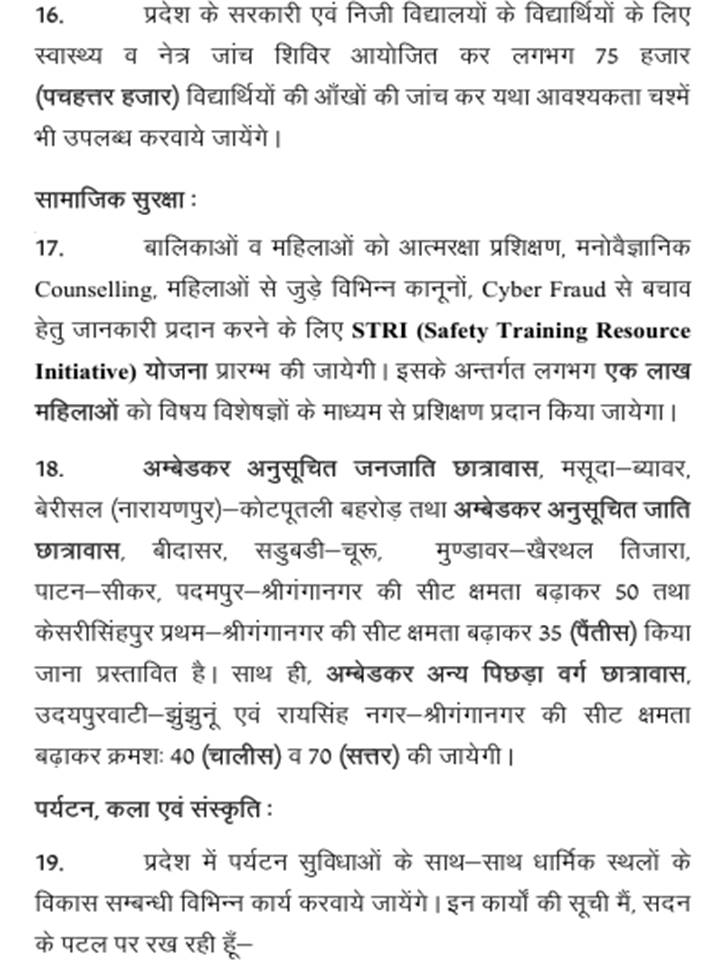 वित्त मंत्री दीया कुमारी ने चर्चा के बाद प्रदेश के लिए कई महत्वपूर्ण घोषणाएं भी कीं। उन्होंने कहा कि 1 लाख बालिकाओं एवं महिलाओं को विशेषज्ञों द्वारा आत्मरक्षा प्रशिक्षण उपलब्ध कराया जाएगा। प्रदेश के शहरी व ग्रामीण क्षेत्रों में विभिन्न सड़कों के निर्माण, मरम्मत व उन्नयन सम्बन्धी कार्य 690 करोड़ रुपए से अधिक की लागत से करवाये जाने के लिए घोषणा की। उन्होंने कहा कि राज्य से निकलने वाले दिल्ली-मुम्बई इंडस्ट्रियल कॉरिडोर के नीमराणा औद्योगिक क्षेत्र में जल एवं पेयजल आपूर्ति सुनिश्चित किये जाने के लिए 1 हजार 12 करोड़ रुपए की लागत से कृत्रिम जलाशय एवं फीडर निर्माण का कार्य करवाया जाएगा। इसके लिए आगामी वर्ष 200 करोड रुपए की राशि व्यय की जानी प्रस्तावित है।