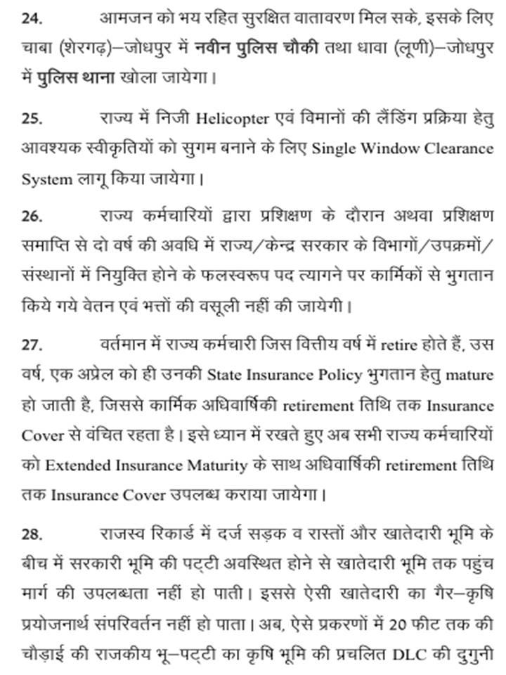 अब तक राजस्व रेकार्ड में दर्ज सड़क व रास्तों और खातेदारी भूमि के बीच में सरकारी भूमि की पट्टी होने से खातेदारी भूमि तक पहुंच मार्ग की उपलब्धता नहीं हो पाती थी। इससे ऐसी खातेदारी का गैर- कृषि कन्वर्जन नहीं हो पाता। अब, ऐसे प्रकरणों में 20 फीट तक की चौड़ाई की राजकीय भू-पट्टी का कृषि भूमि की प्रचलित डीएलसी की दोगुनी दर से भुगतान करने पर सम्बन्धित खातेदार को पहुंच मार्ग हेतु आवंटन किया जा सकेगा। उप मुख्यमंत्री एवं वित्त मंत्री दिया कुमारी द्वारा की गई घोषणाओं की सूची नीचे देखे।