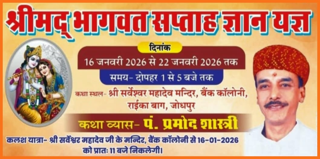 श्रीमदभागवत सप्ताह का आयोजन 16 जनवरी से धार्मिक कथा आयोजन समिति जोधपुर व बैंक कॉलोनी महिला मण्डल का आयोजन जोधपुर(दूरदृष्टीन्यूज),श्रीमदभागवत…
