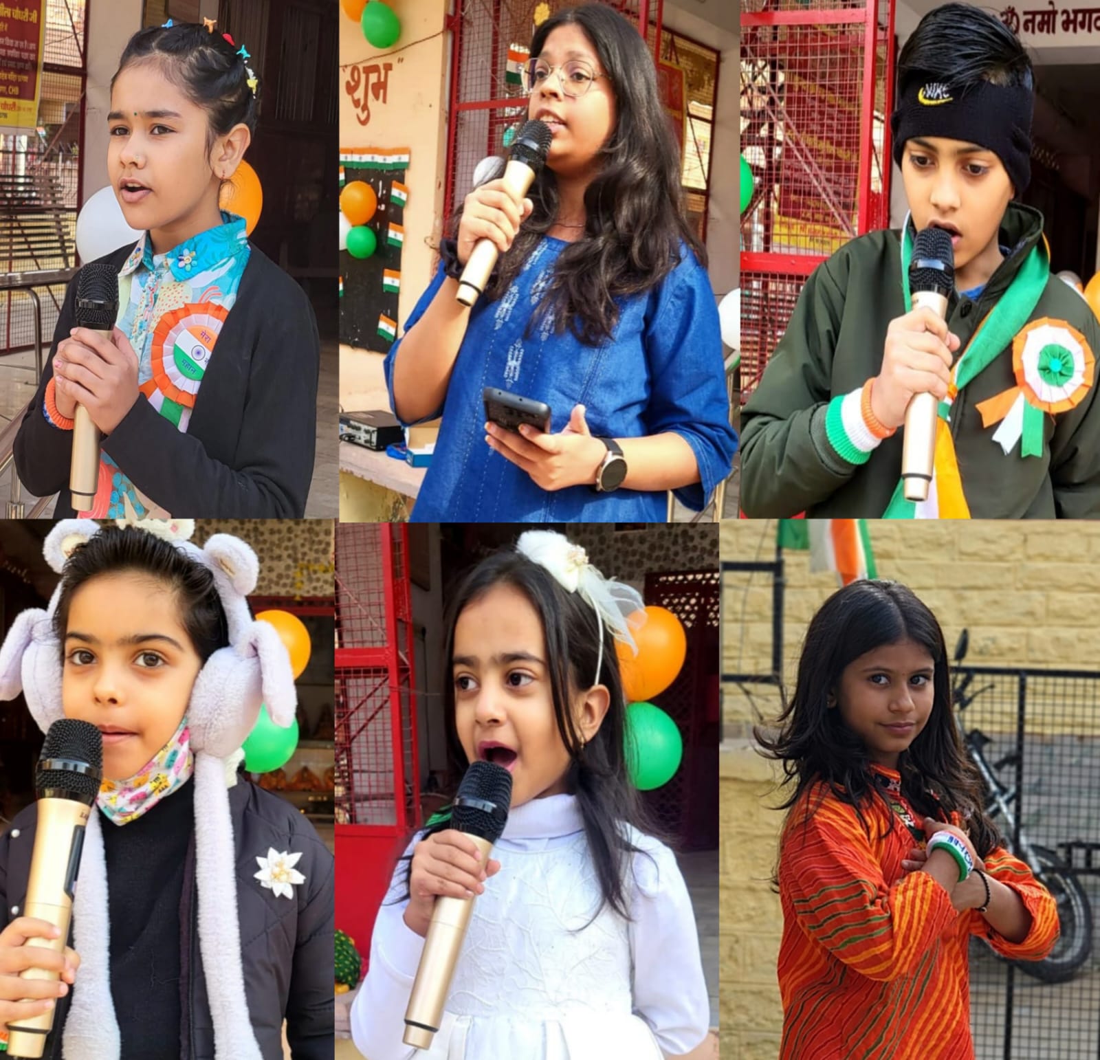 इसके बाद स्थानीय बच्चों ने देश भक्ति के गीत,कविताएं,गणतंत्र के महत्व को इंगित करते हुए अपनी रचाएं सुना कर राष्ट्र प्रेम की भावना को प्रगाढ़ किया। बच्चों में महिमा और प्रिंशु ने नृत्य की प्रस्तुति दी।अपूर्वा अग्रवाल,वेदांशी,आरव चौधरी ने गणतंत्र पर स्पीच दी।कियाँसी भरत थानवी ने कविता सुना कर तालियां बटोरी। कॉलोनी के कई वरिष्ठ नागरिकों ने भी देश भक्ति के तराने गा कर माहौल को देश प्रेम से जोड़ने में महती भूमिका निभाई। इस अवसर पर आदर्श नगर की महिलाओं ने देश भक्ति से ओतप्रोत सामूहिक गीत सुना कर देशभक्ति के जज्बे को और भी प्रगाढ़ कर दिया।