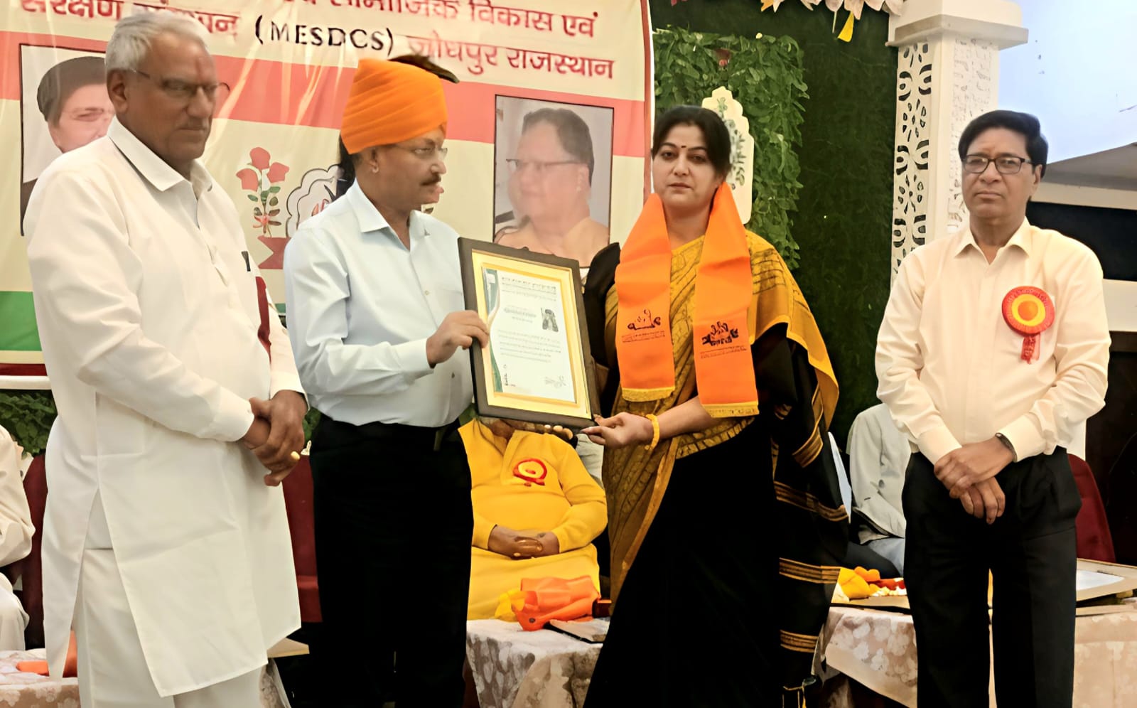 जोधपुर(डीडीन्यूज),स्मिता शर्मा मेसडेस उत्कृष्ट शिक्षा पुरस्कार- 2025 से सम्मानित। शिक्षा क्षेत्र में नवाचार और उत्कृष्ट सेवाएं देने पर किड्स किंगडम स्कूल,रामेश्वर नगर की प्राचार्य श्रीमती स्मिता शर्मा को मेसडेस उत्कृष्ट शिक्षा पुरस्कार- 2025 से सम्मानित किया गया है।
