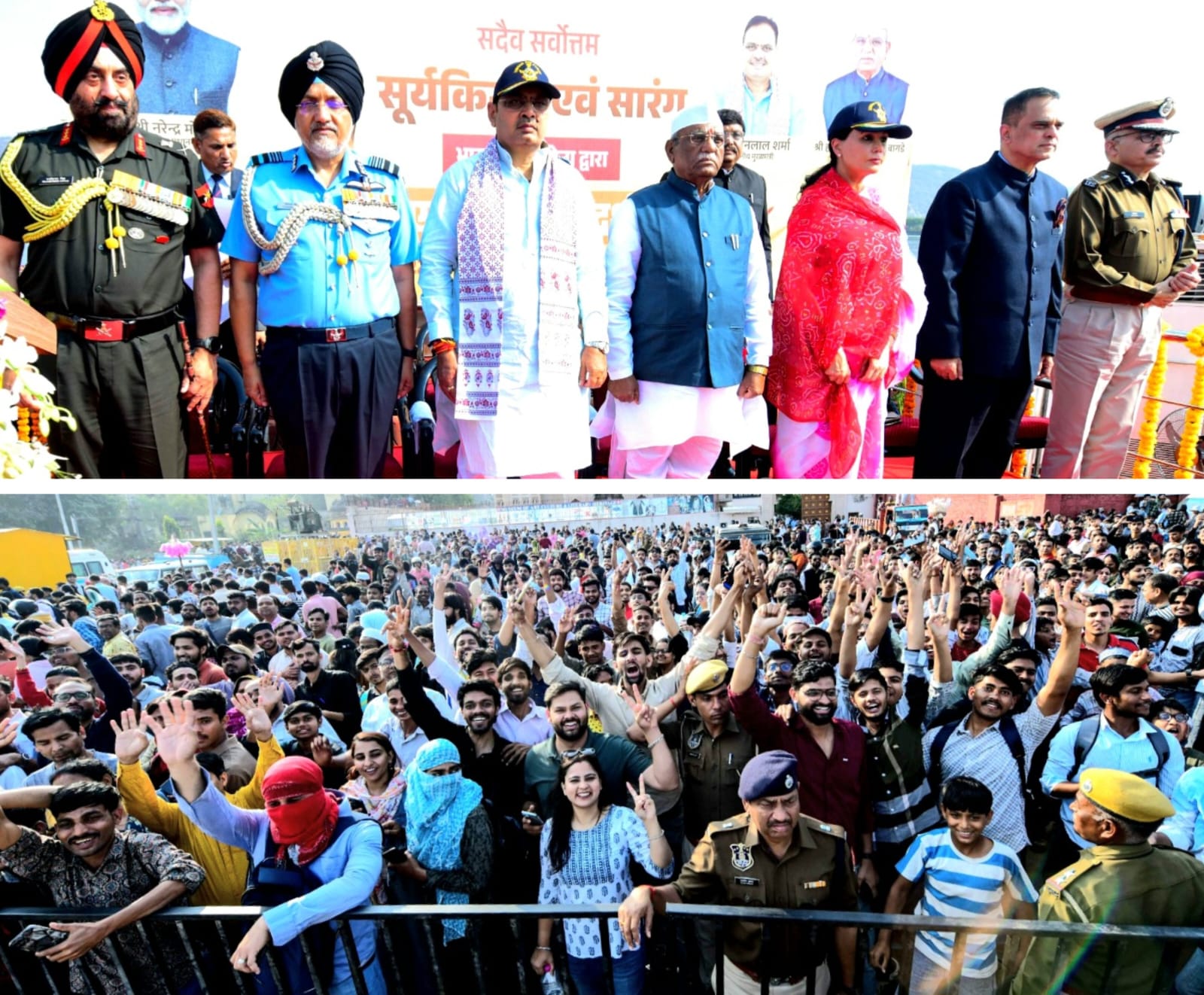 जयपुर(दूरदृष्टीन्यू),सूर्यकिरण एरोबैटिक व सारंग हेलिकॉप्टर डिस्प्ले देख दर्शक हुए अभिभूत।मुख्यमंत्री भजनलाल शर्मा ने रविवार को राज्यपाल हरिभाऊ बागड़े की उपस्थिति में जयपुर में जलमहल की पाल पर भारतीय वायु सेना के सूर्यकिरण एरोबैटिक एवं सारंग हेलिकॉप्टर डिस्प्ले कार्यक्रम में शिरकत की।