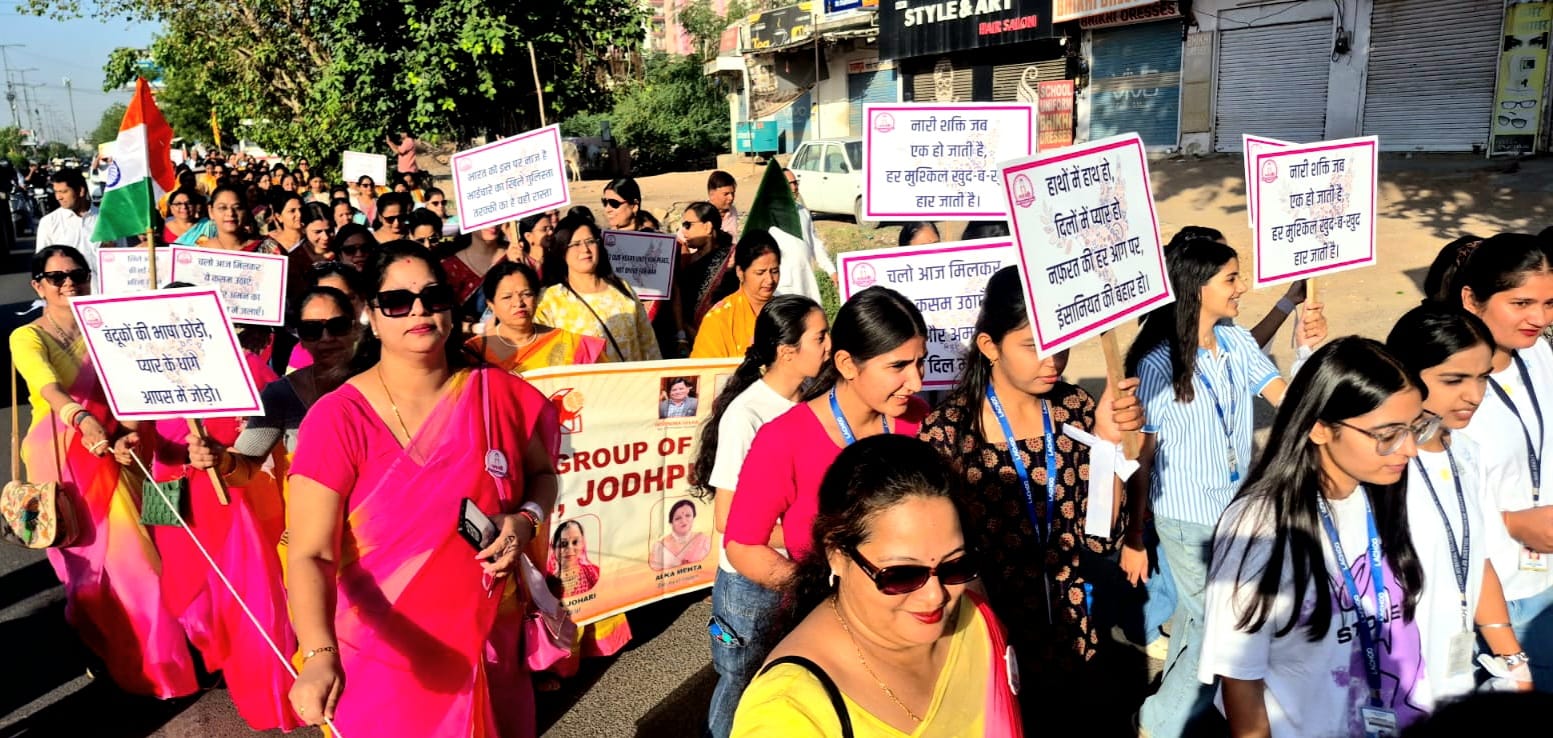 जोधपुर(दूरदृष्टीन्यूज),विश्व शांति के समर्थन में महिलाओं ने निकाली पीस रैली।विश्व में बढ़ती हिंसा और युद्ध जैसी परिस्थितियों के विरोध में शहर में महिलाओं द्वारा एक पीस रैली का आयोजन किया गया। मनस्वी क्लब के नेतृत्व में आयोजित इस रैली में विभिन्न सामाजिक,शैक्षणिक एवं सेवा संगठनों की सक्रिय भागीदारी रही। जबकि इसे भारतीय जनता पार्टी और भारतीय राष्ट्रीय कांग्रेस सहित विभिन्न वर्गों का समर्थन भी मिला।
